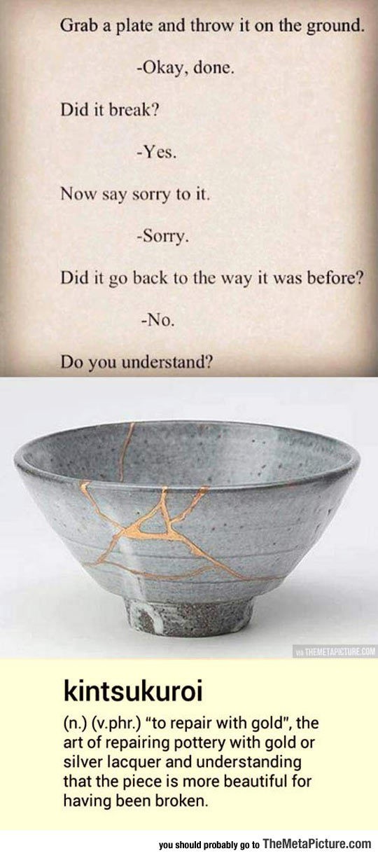 It’s still not the same. Maybe it’s something more beautiful. But it’s not the fact that it broke that makes it beautiful. It’s the work put into it. It’s the fact that people made the effort to salvage it, because it was worth salvaging, because it was important enough to salvage. It’s the care that makes the beauty.
