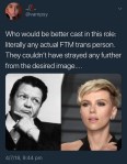 Nobody fucking cares about your awards, Scarjo. She’s not getting any woke points for this. And it’s becoming a concerning pattern. After the GitS thing she can’t pretend unawareness of the problem. She has no excuse. She CAN make a difference, she CAN help the community, by stepping aside and letting an actual trans man take the fucking job.